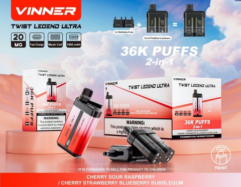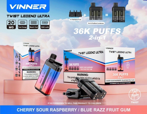 VINNER Twist Legend Ultra 2-in-1 Disposable Vape (36,000 Puffs) – CHERRY SOUR RASPBERRY / CHERRY STRAWBERRY BLUEBERRY BUBBLEGUM